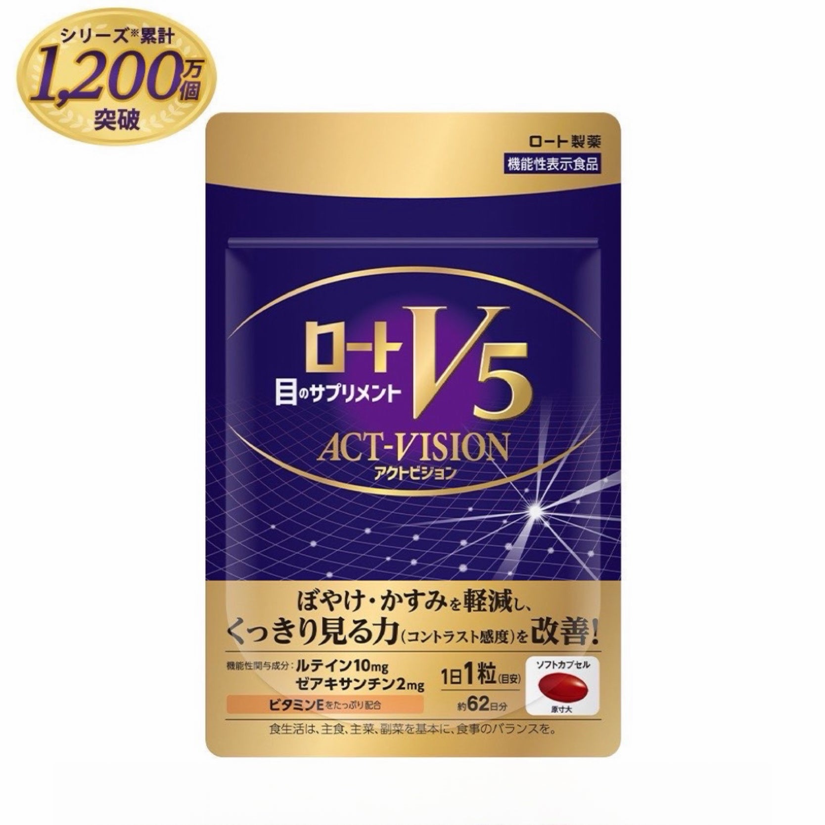 “Roto V5 Act Vision”在1粒中加入了功能性成分,採用了光滑且易於吞咽的軟膠囊。 為了維持觀看能力,希望能持續很長時間,所以也注重了1天1粒(基準)和容易飲用